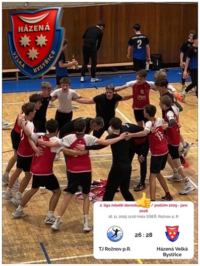 V neděli 16. 11. 2025 jsme odehráli utkání 2. ligy mladšího dorostu SM na horké půdě našeho soupeře. Soupeřem byli kluci z Rožnova v tabulce na třetím místě. Takže jsme přijali s respektem, ale určitě ne odevzdaně. Před utkáním jsme si zopakovali, abychom hráli rychle, důrazně a zodpovědně. V poločase jsme prohrávali 15:13, ale po dobrém výkonu především v obraně. V šatně jsme apelovali, aby kluci pokračovali ve zodpovědnosti a byli soustředění jen na sebe a nevšímali si případných křivd. Postupem času jsme trpělivosti výsledek překlopili na naší stranu a zaslouženě vyhráli s konečným výsledkem 26:28.